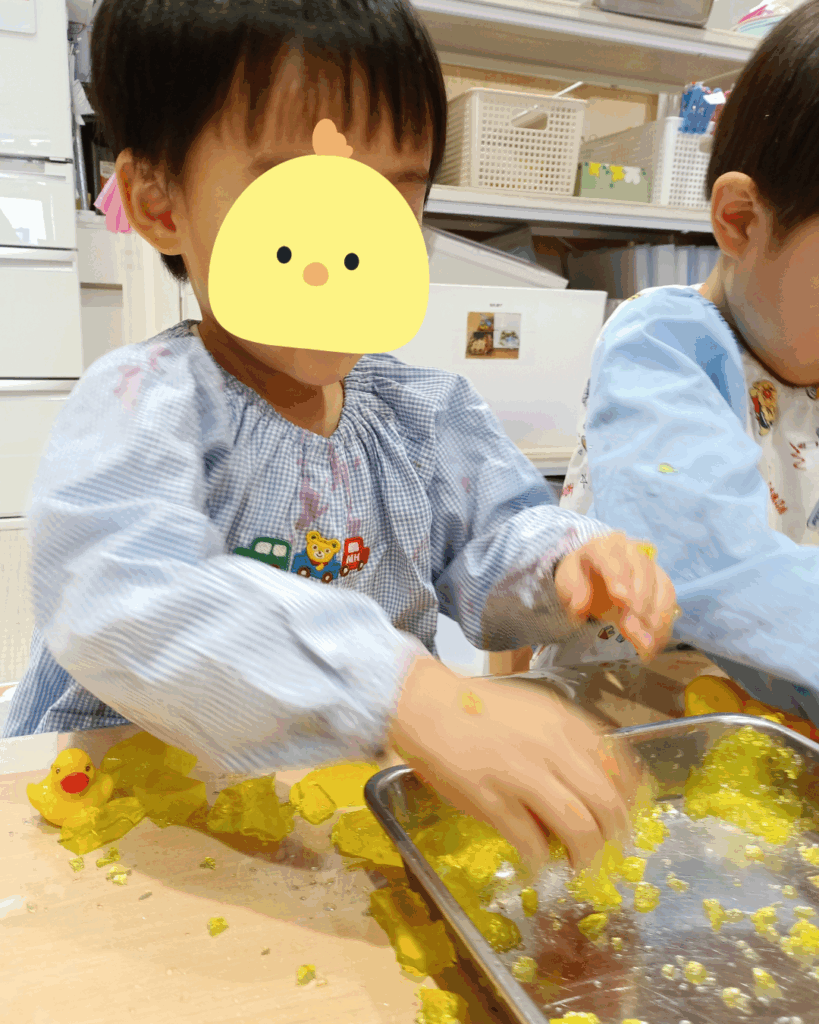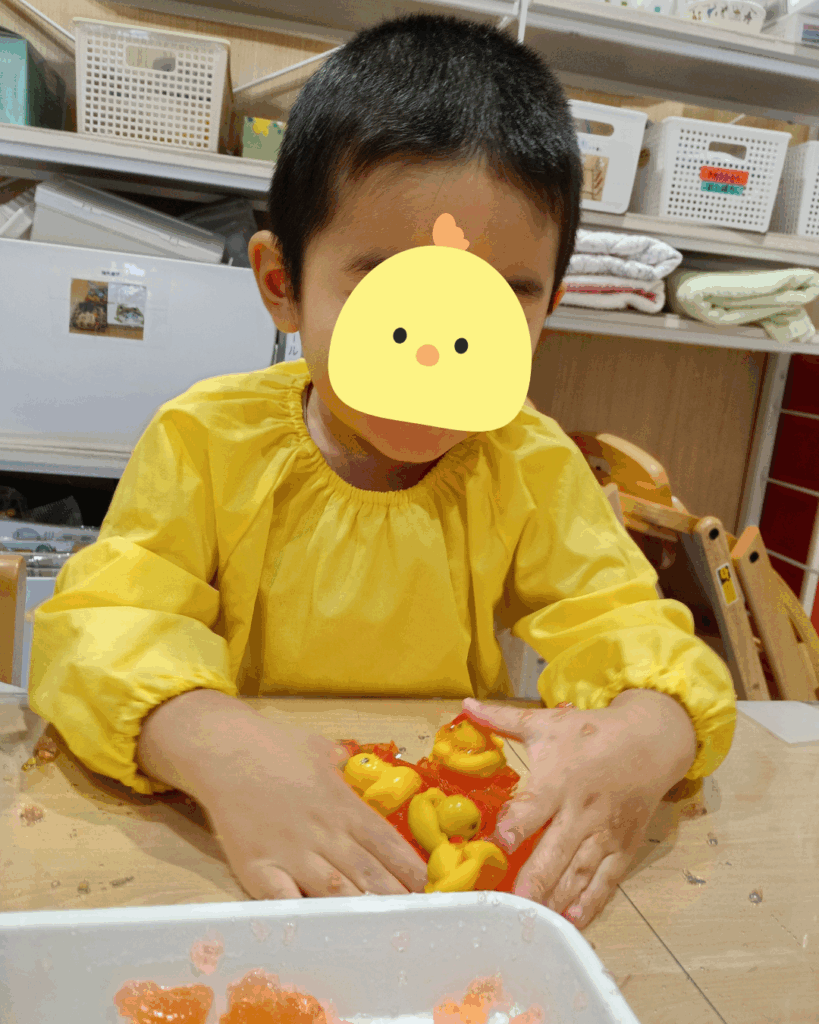 寒天の中にあひるを浮かべ、「あひるさんお風呂入ってるね~」とお話をしたり