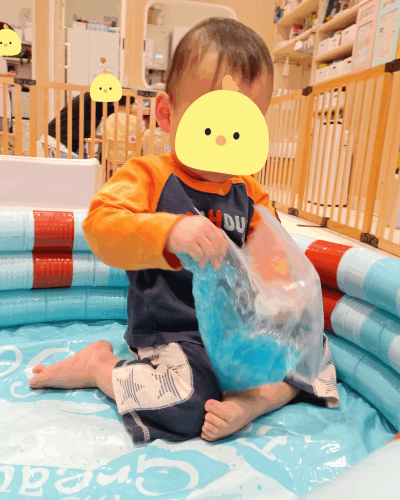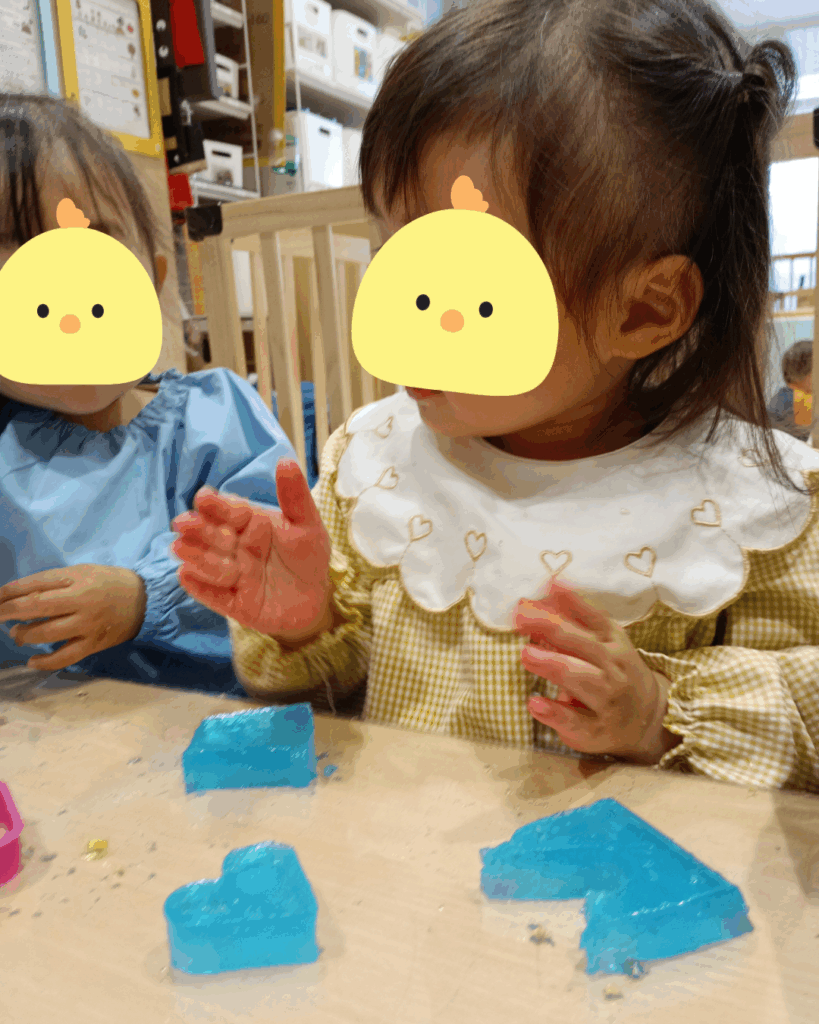 ひよこ組さんはジップロックの中に寒天を入れて、感触を楽しみました😌