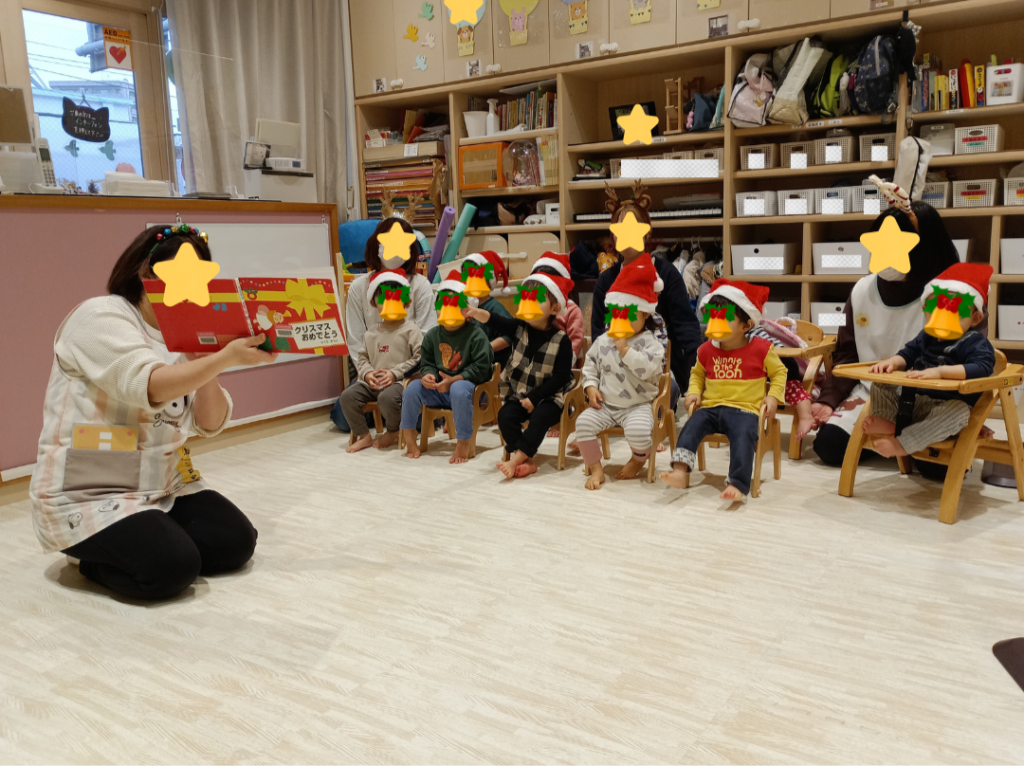 クリスマスの絵本やカードゲームをして、ジングルベルを歌っていると“ピンポーン!”