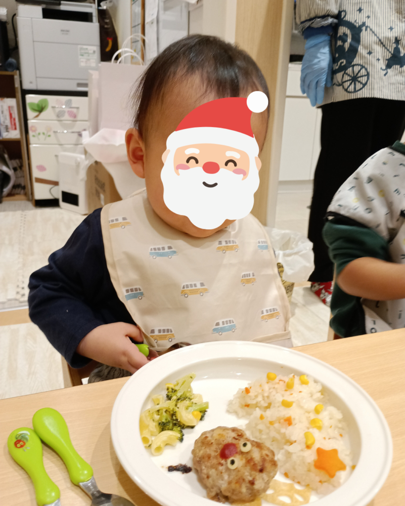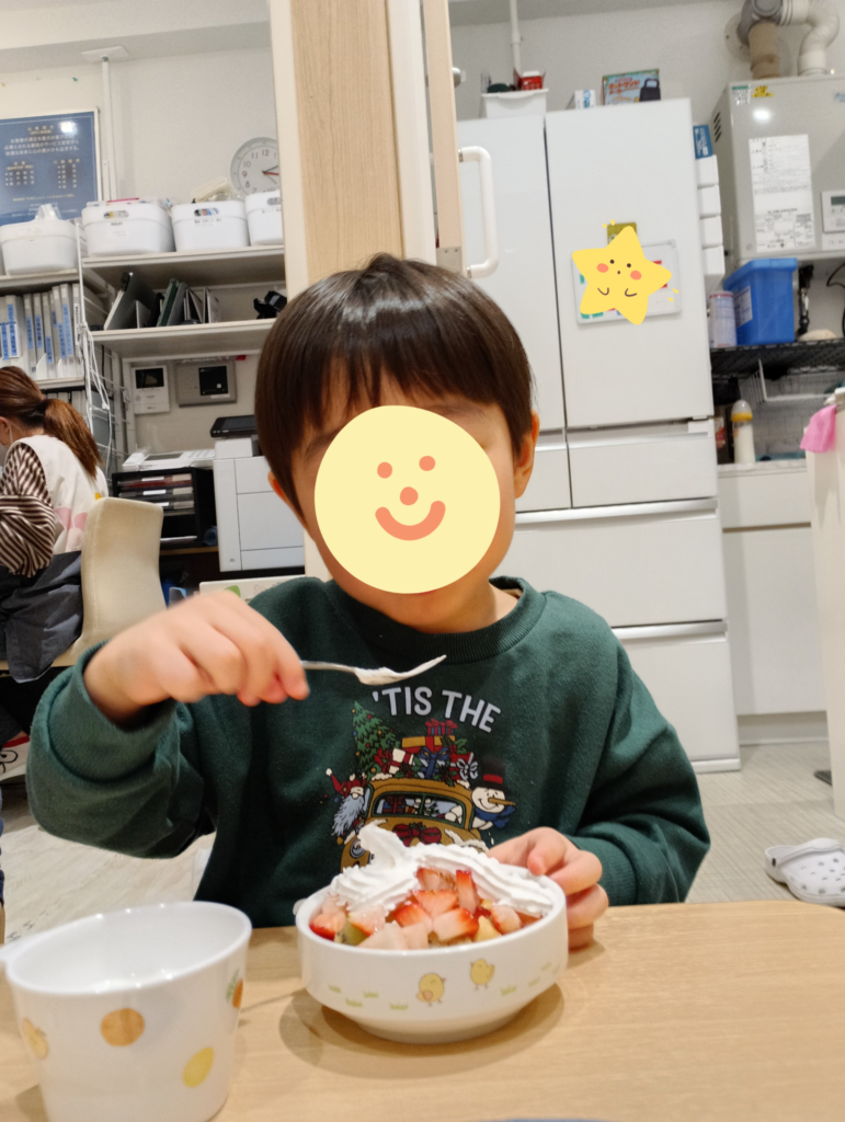 お待ちかねの給食も「トナカイさんだ!」「おいしいね!」と、みんな大喜び🎶この日は午後のおやつもスペシャルメニューのクリスマスパフェ🍨好きな果物やクリームを乗せて、大喜びで食べていました🥄