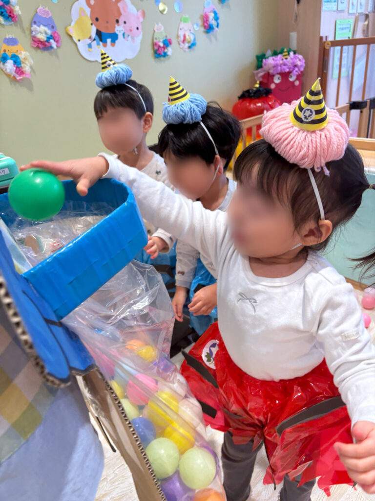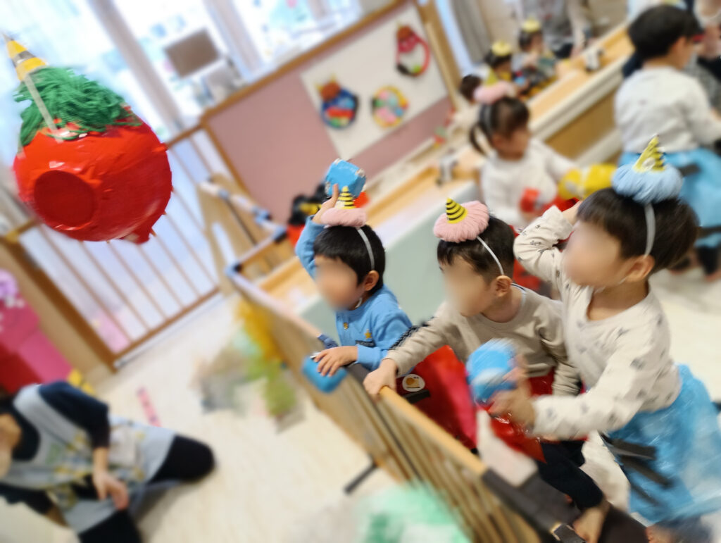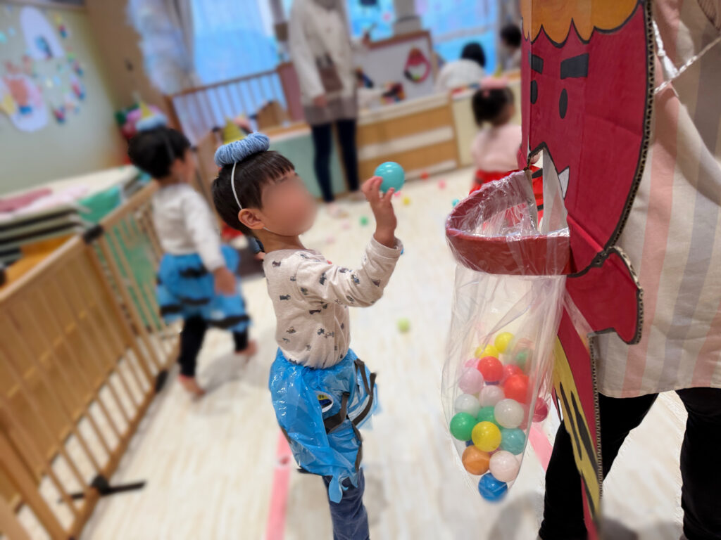 次は、先生たちが背負った鬼に玉入れをしました。「鬼は外~!」と言いながら元気いっぱい追いかけていましたよ。その後は鬼のくす玉に向かってボールを投げ、無事に割れると「やった~!」と大喜びでした😃