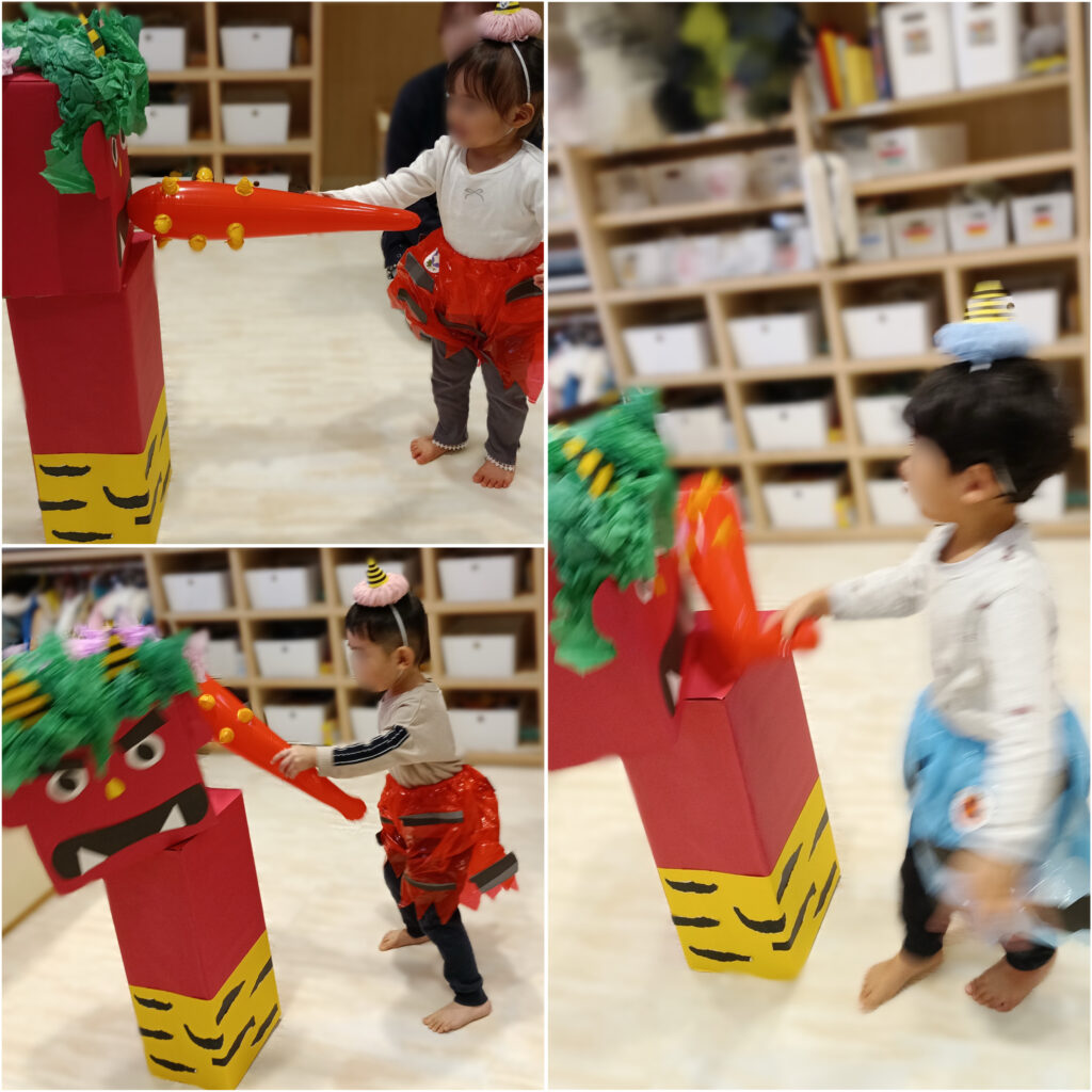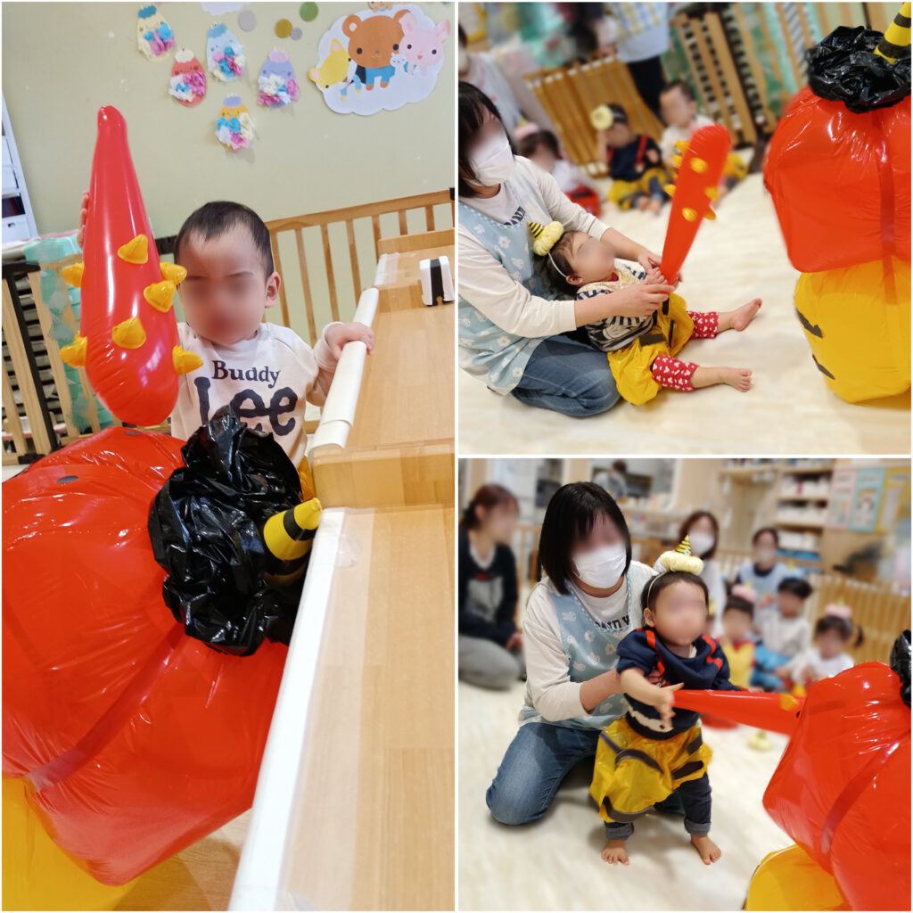 ひよこ組さんは風船の鬼、りす組さんこあら組さんは段ボールの『怖い顔の鬼』『かわいい顔の鬼』を選んで、金棒を持って鬼退治をしました✨なんと、みんな泣かずにできましたよ👏