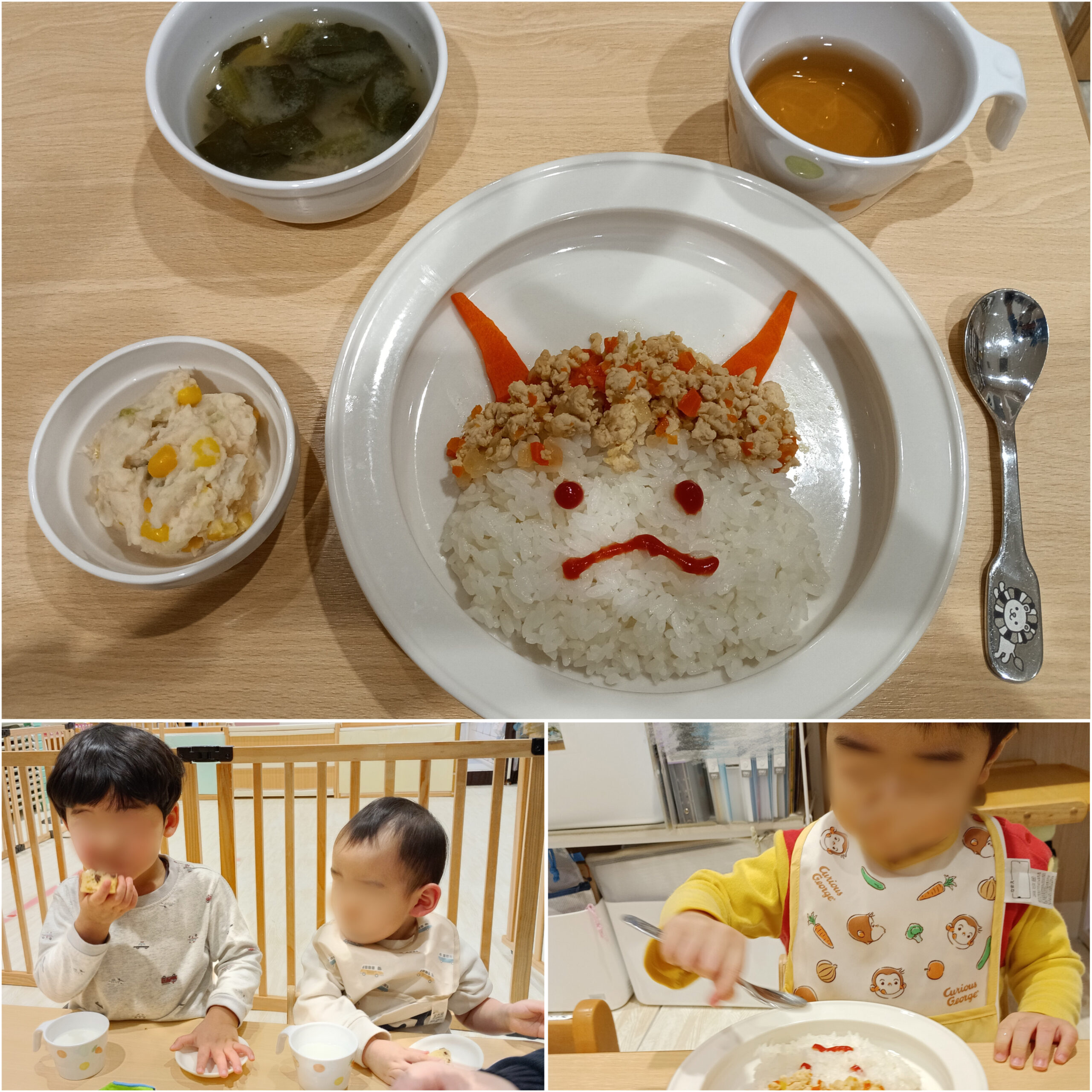 給食は『おにさんライス』。おにさんの顔がなくならないように大事に食べている子、おいしくてあっという間に完食する子、様々な様子が見られました✨午後おやつの『おにのパンツ蒸しパン』も大人気で「オニのパンツはいいパンツ~🎵」と、楽しみながら食べていましたよ😊