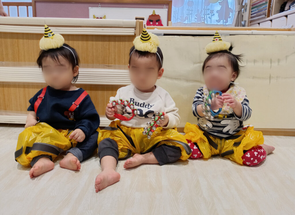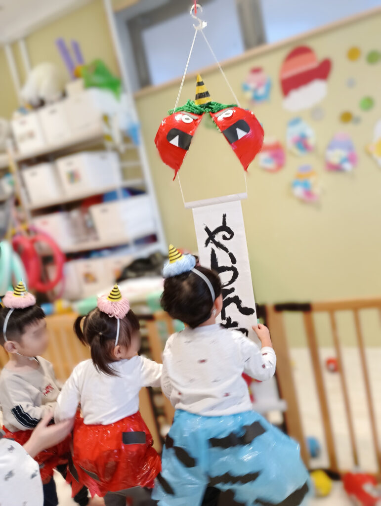 それは、「豆まきの日、保育園行きたくないな…」とならないようにとの先生たちの思いから🥲✨だんだんと不安は消えて、「大丈夫だよね!」「鬼は外、できるよ!!」と言っていた子どもたち。