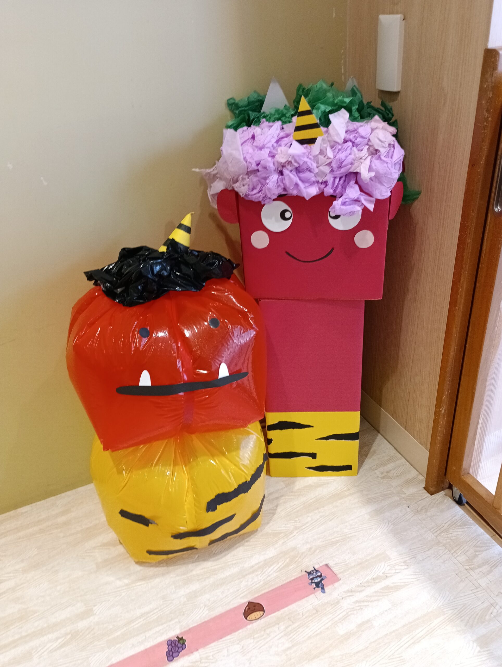 “おに”と聞いただけで涙が出てしまう子、「こわい!嫌だ!」と言う子のために、先生たちはいくつも絵本や紙芝居を用意して「鬼は怖くないよ!豆まきってこういう意味があるんだよ!」と、毎日のように伝えてきました(笑)