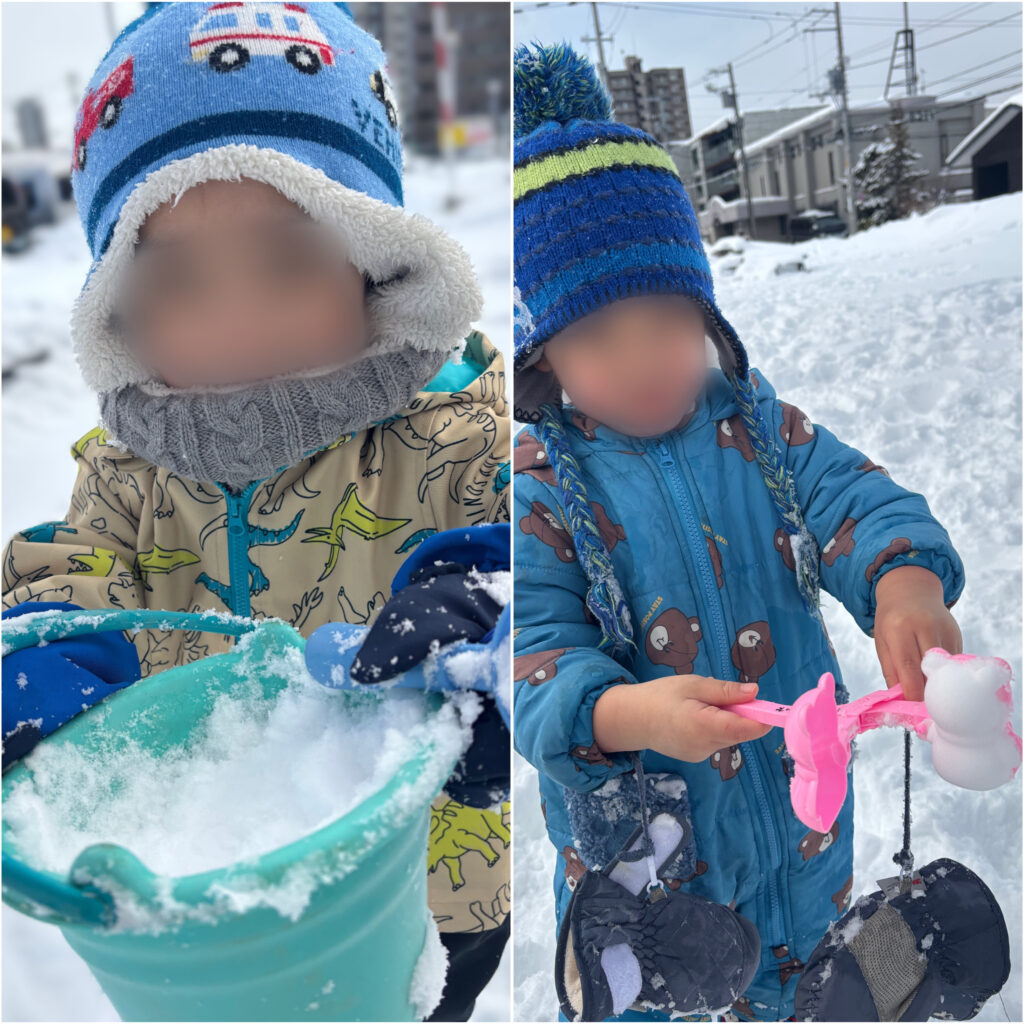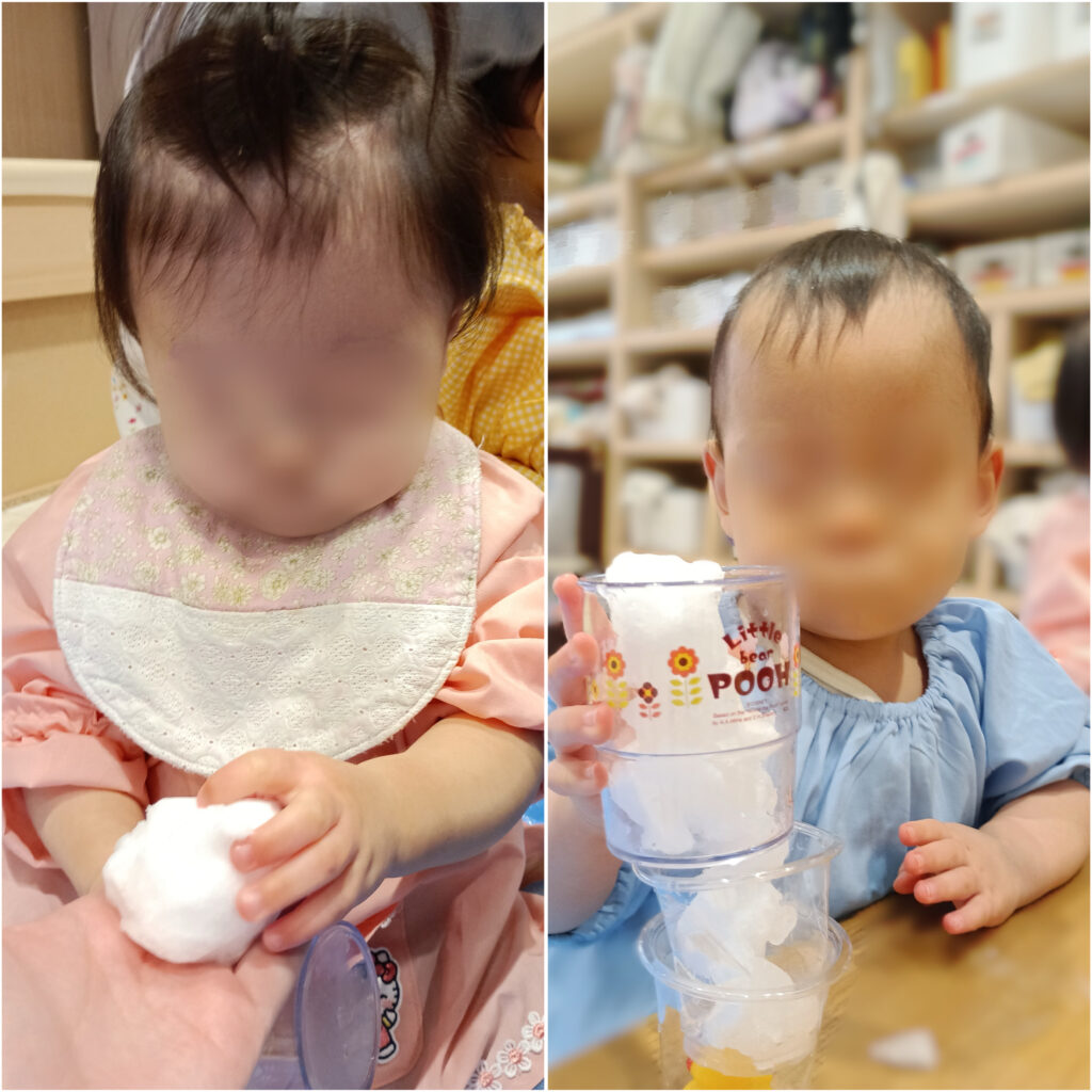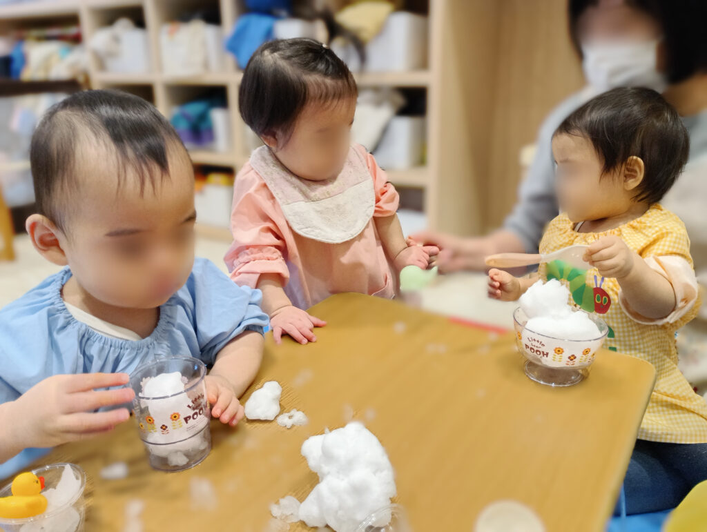 雪をにぎにぎ…と触って“冷たい!”と手を離す子、右手左手と持ちかえてじっくり観察する子と、楽しみ方はそれぞれ!おままごとはみんな大好きで、カップやコップに入れて乾杯したりカップに入れたりと盛り上がっていました✨