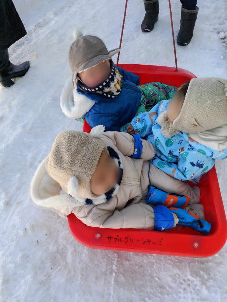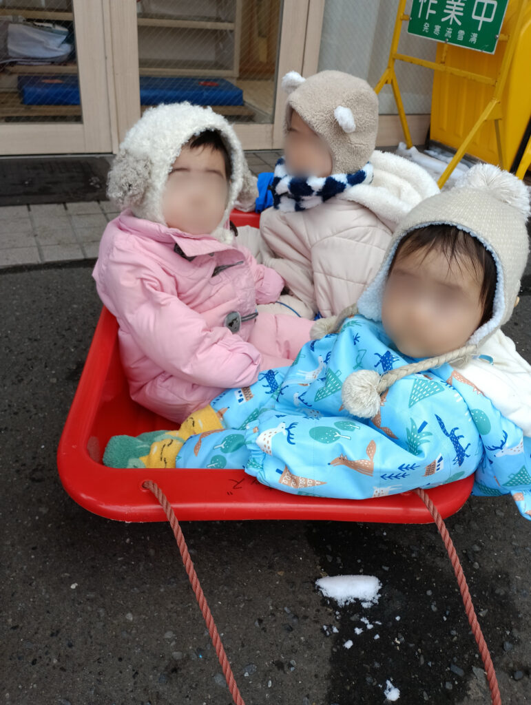 ソリに乗ってお散歩にも行きました!座っているだけでかわいいですね💕いざ出発すると「え~ん💦」と泣いてしまう子もいましたが、「ゴーゴー!」とご機嫌で楽しんでいる子も✨すれ違う町の方からも「かわいいね!」「がんばれ~!」と温かい声をいただきました😊