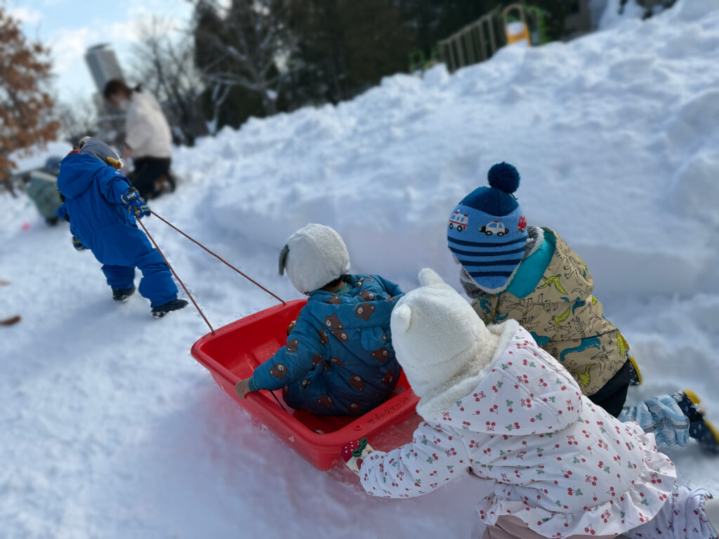 なかでも、そり遊びが大好きなみんなは、先生に引っ張ってもらうだけでなく、自分たちで協力してソリを引いたり押したりしながらそり遊びを楽しんでいて、そんな様子からも仲の良さが伝わってきました💕